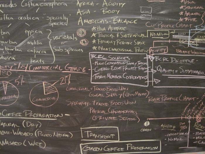 This image is a chalkboard at Barrington Coffee Roasting Company that represents a tiny slice of the vast knowledge, experience and passion that our client has for their product. What a telling image! Most of us think of coffee as something to look forward to in the morning, a warm, aromatic pick-me-up. Of course the ongoing revolution in coffee sparked by Starbucks, the Seattle coffee scene, and others is nothing new. Gregg and Barth at BCRC have been there since the beginning, always focused on crafting a product of impeccable quality and uncompromising values.